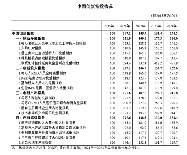 10月29日,国家统计局社科文司《中国创新指数研究》课题组发布的2024年中国创新指数测算结果显示,2024年中国创新指数为174.2(以2015年为100),比上年增长5.3%。分领域看,创新环境指数、创新投入指数、创新产出指数和创新成效指数分别为186.0、162.6、215.8和132.4,分别比上年增长4.9%、5.1%、8.1%和1.9%,我国科技创新能力持续提升。