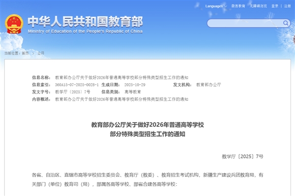 本报北京11月6日电(记者丁雅诵)教育部日前印发《关于做好2026年普通高等学校部分特殊类型招生工作的通知》,要求有关高校认真落实特殊类型招生考生报名资格审核的主体责任,明晰相关类型人才选拔培养定位,科学确定本校报考条件、资格审核程序,会同各地严格审核考生的身份、学籍、省级统考、校考、高考报名等信息,不得降低报考条件,不得放宽资格审核标准。