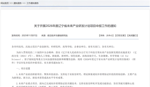 为深入贯彻党的二十届四中全会精神,落实《辽宁省人民政府办公厅关于科技引领未来产业创新发展的实施意见》(辽政办发〔2024〕4号),围绕人工智能、新能源、新材料、绿色低碳、深海深地空天、生命健康、科学智能(AI for Science)、原子级制造等重点方向加强原始创新和颠覆性创新,现将《2026年度辽宁省未来产业研发计划项目指南》(附件)予以印发并组织申报项目,有关事项通知如下: