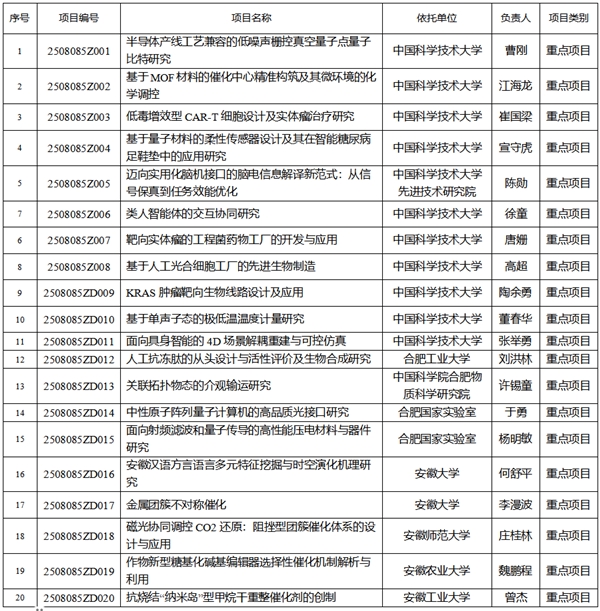 根据《安徽省自然科学基金管理办法(修订)》(皖科基奖〔2020〕16号)、《关于开展2025年度安徽省自然科学基金项目申报工作的通知》(皖科基秘〔2025〕121号)要求,经申报推荐、专家评审和会议研究,现下达2025年度安徽省自然科学基金项目计划(第二批次),共立项重点项目20项。