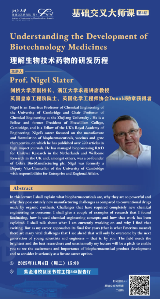 今年11月4日,斯莱特教授已在浙江大学基础交叉研究院主持“大师课”,以“理解生物技术药物的研发历程”为题,系统梳理了生物制药行业的发展脉络。
