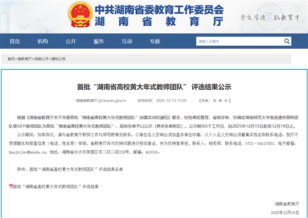12月15日,湖南省教育厅发布《首批“湖南省高校黄大年式教师团队” 评选结果公示》。