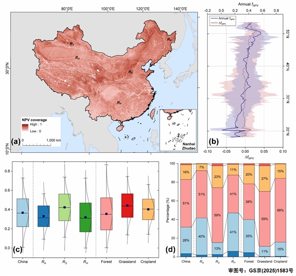 记者24日从南京大学获悉,该校科研团队通过构建高精度的非光合植被(NPV)遥感观测反演框架,首次绘制全国陆地NPV最大覆盖度时空分布图,并创新性地提出陆地生态系统碳交换通量指数,揭示了中国陆地生态系统中,NPV对气候梯度的响应特征及其在碳循环中的核心作用。该成果近日刊发于中国地学领域期刊《中国科学:地球科学》。