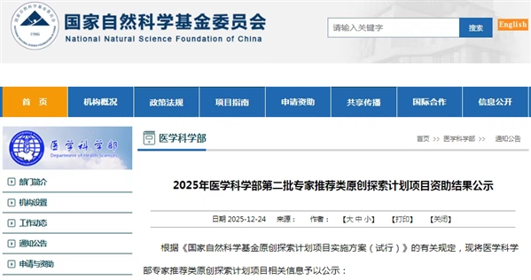 12月24日,国家自然科学基金委员会网站公示2025年医学科学部第二批专家推荐类原创探索计划项目资助结果,共涉及4个项目,资助总额为1100万。