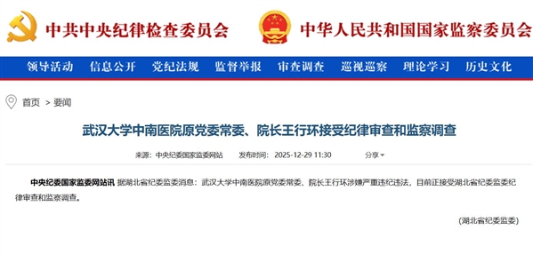 中央纪委国家监委网站讯据湖北省纪委监委消息:武汉大学中南医院原党委常委、院长王行环涉嫌严重违纪违法,目前正接受湖北省纪委监委纪律审查和监察调查。
