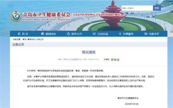 中新网1月3日电 针对网传“青岛某医院护士带男朋友进医院配药室”事宜,青岛市卫健委3日在官网发布情况通报称,该委第一时间开展调查。
