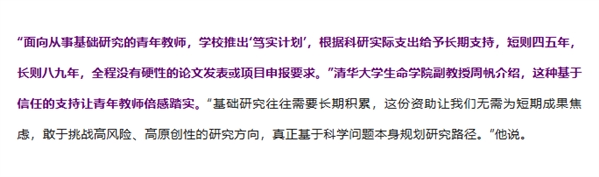清华大学推出“笃实计划”,面向从事基础研究的青年教师,根据科研实际支出给予长期支持,短的四五年,长的八九年,全程没有硬性考核要求。