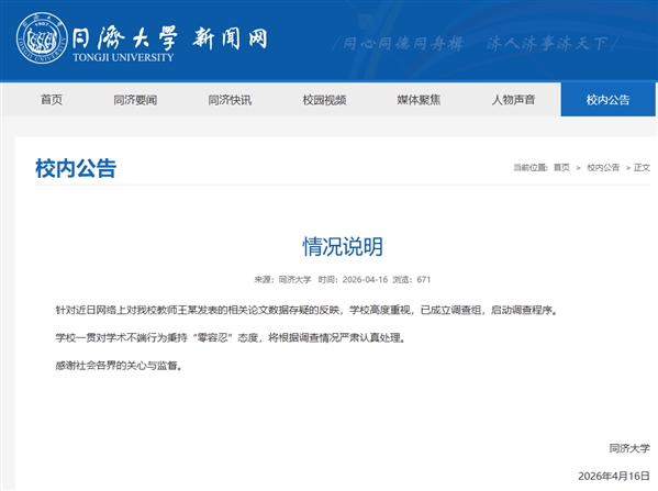 4月16日,同济大学官网发布情况说明,称针对近日网络上对该校教师王某发表的相关论文数据存疑的反映,学校高度重视,已成立调查组,启动调查程序。学校一贯对学术不端行为秉持“零容忍”态度,将根据调查情况严肃认真处理。