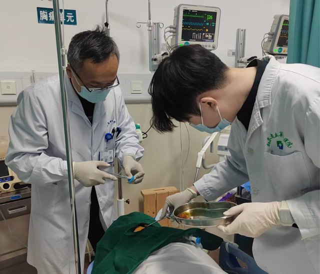 山东省立第三医院急诊医学科李春光主任医师(左)正在为患者缝合伤口。受访者供图