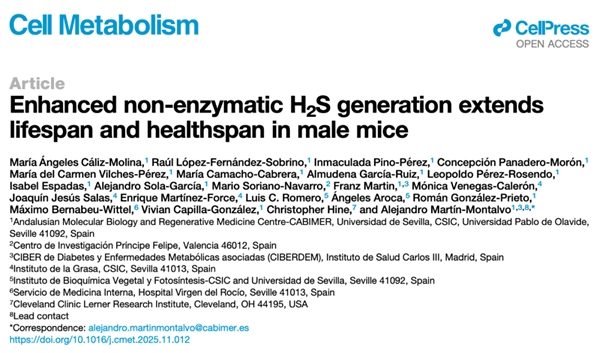 2025 年 12 月 19 日,Cell 子刊 Cell Metabolism 上发表了题为:Enhanced non-enzymatic H2S generation extends lifespan and healthspan in male mice 的研究论文。