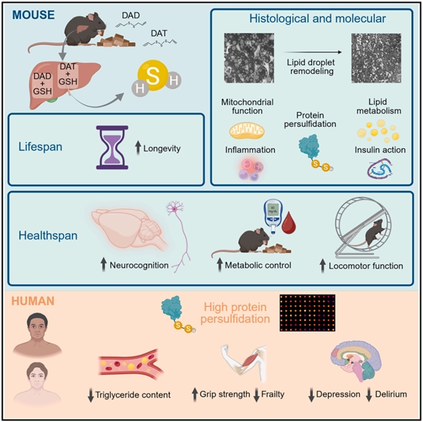 该研究探索了天然的二烯丙基硫化物(DAS)促进的非酶促硫化氢(H2S)生成在体内的作用,结果显示,DAS 延长了野生型雄性小鼠的寿命,并改善了其健康寿命,包括葡萄糖调节、运动功能和神经认知能力。
