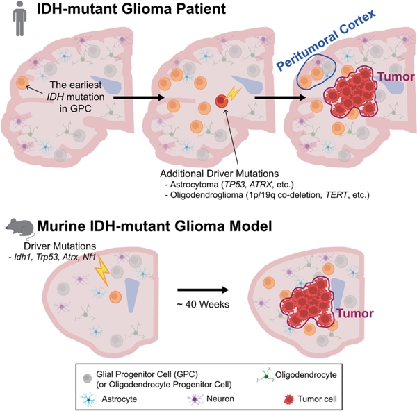 结合细胞类型特异性突变分析、克隆进化方向、来自患者大脑的空间转录组学以及由突变的少突胶质细胞祖细胞产生的癌症小鼠模型,该研究确定具有初始IDH突变的胶质祖细胞负责IDH突变胶质瘤的发展。