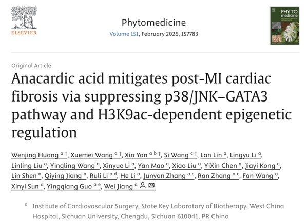 近日,四川大学华西医院心血管外科团队在《植物医学》(Phytomedicine)发表重磅研究成果,首次揭示天然化合物安卡酸(Anacardic Acid, AA)通过双重机制缓解心肌梗死后纤维化的分子路径。这项研究不仅发现了安卡酸对p38/JNK-GATA3信号轴与H3K9ac表观遗传调控的协同作用,更为开发针对心脏纤维化的新疗法提供了关键理论依据。