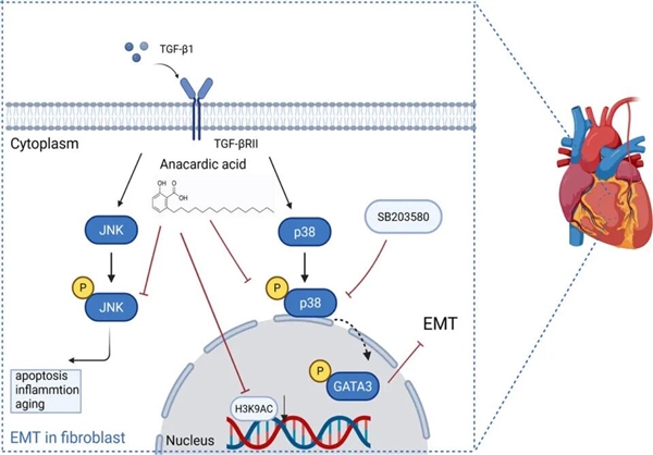 参考Huang, Wenjing, et al. "Anacardic Acid Mitigates Post?MI Cardiac Fibrosis via Suppressing p38/JNK–GATA3 Pathway and H3K9ac?Dependent Epigenetic Regulation." Phytomedicine (2026): 157783.
