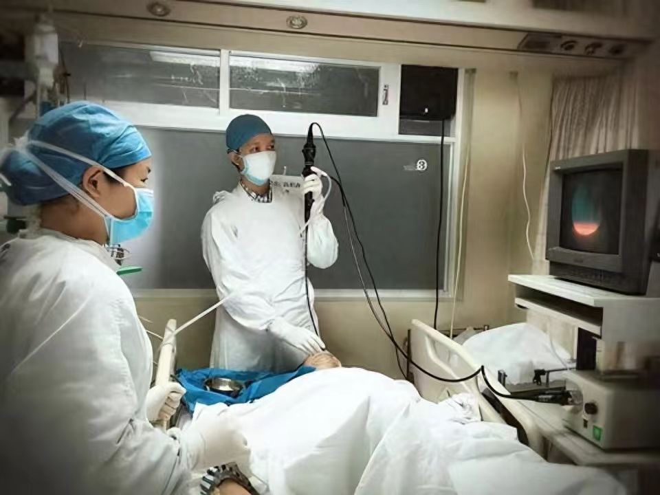 广州八院感染病中心主任医师关家龙正为患者做气管镜检查。受访者供图