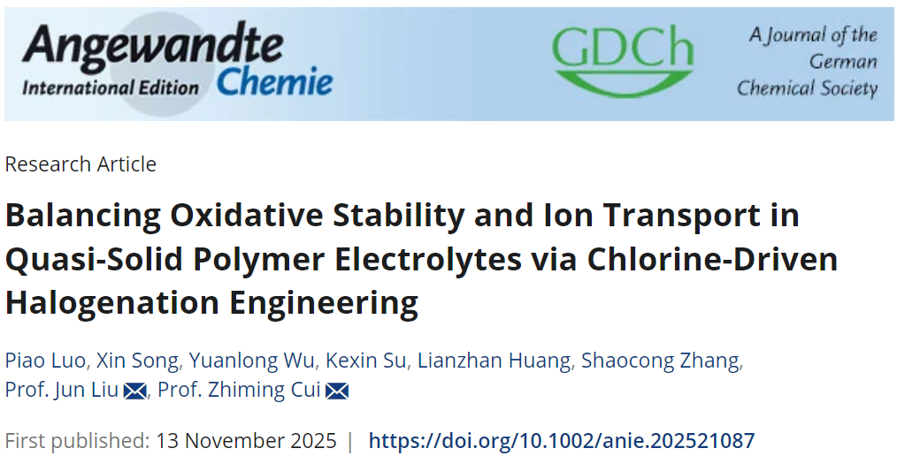 2025年11月13日,华南理工大学崔志明、刘军在国际知名期刊Angewandte Chemie International Edition发表题为《Balancing Oxidative Stability and Ion Transport in Quasi-Solid Polymer Electrolytes via Chlorine-Driven Halogenation Engineering》的研究论文,Piao Luo、Xin Song为论文共同第一作者,崔志明、刘军为论文共同通讯作者。