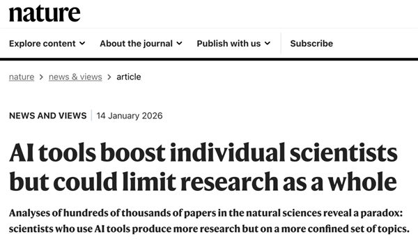 Nature 同期发表了题为:AI tools boost individual scientists but could limit research as a whole 的 News and Views 文章,文章指出,AI 工具能提升科学家个体的科研能力,但可能限制整个科研领域的发展。