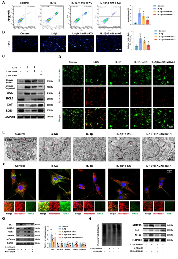 机制上,α-KG能显著降低IL-1β诱导的活性氧积累,减轻氧化应激损伤。进一步研究发现,α-KG促进了受损线粒体的选择性清除(即线粒体自噬),表现为PINK1/Parkin通路激活及自噬标志物LC3B-II增加。当使用线粒体自噬抑制剂Mdivi-1时,α-KG的抗氧化和抗凋亡作用被完全阻断,这直接证明了α-KG的保护效应依赖于其促进线粒体自噬的能力。