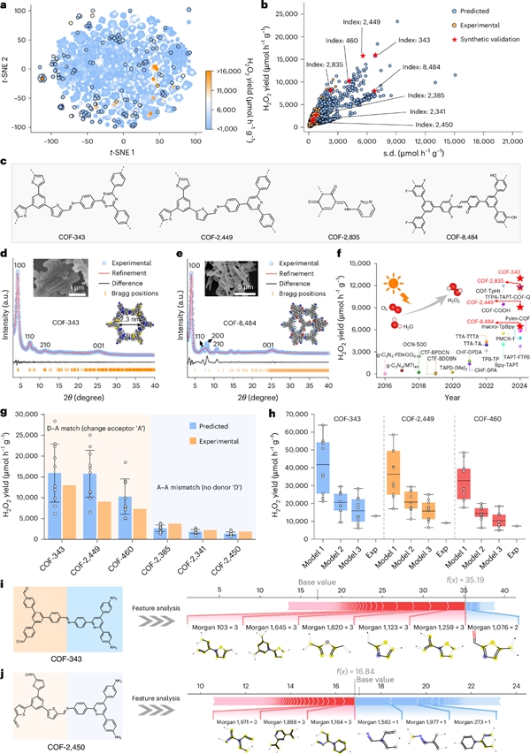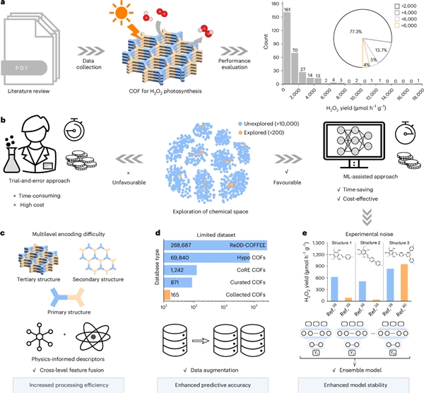 过氧化氢(H2O2)是一类环境友好型氧化剂及潜在能源载体,在化工制造与能源技术领域具有重要应用价值。当前工业生产主要依赖高能耗、伴随污染排放的蒽醌法,而基于水、氧气和太阳光的光催化合成路径,被认为是更具可持续性的替代方案。共价有机框架材料(COFs)因具备可调π共轭结构、给受体架构及良好化学稳定性,被视为光催化H2O2合成的理想平台。然而,现有研究整体性能仍受限制。统计显示,约77%的COFs光催化剂H2O2产率低于2000 μmol·h-1·g-1,仅约4%超过6000 μmol·h-1·g-1(图1a)。这一现状反映出材料设计范式的根本局限:一方面,传统实验“试错法”效率低下,仅能覆盖极小比例的化学空间;另一方面,机器学习方法在COFs体系中面临“双重技术瓶颈”,即多级结构特征难以高保真编码,以及小样本数据存在样本匮乏与性能噪声问题,严重制约模型预测精度与泛化能力(图1c-e)