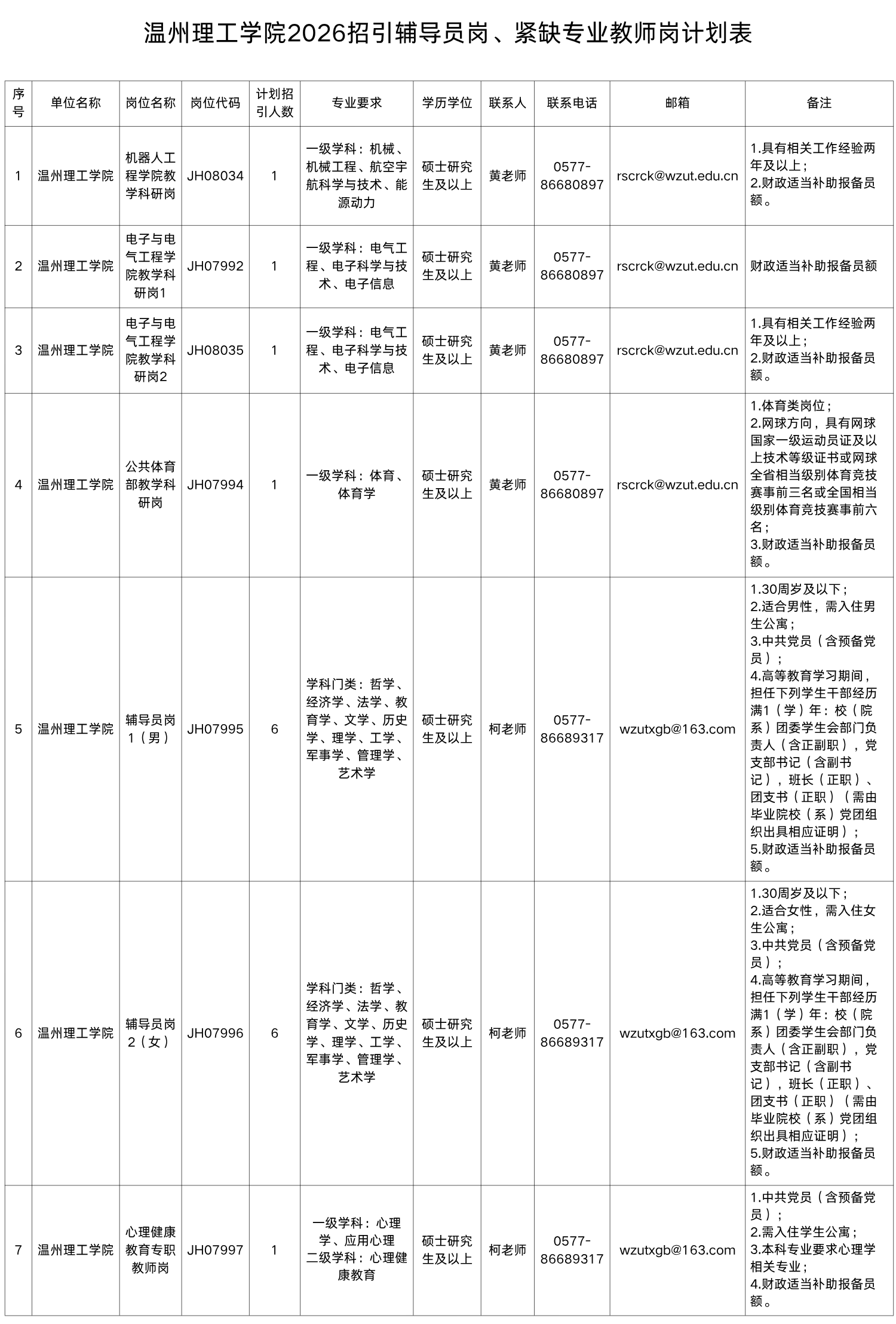 为积极推进创新温州建设和人才强市战略部署,服务“5+5+N”现代产业和社会公益事业发展,为温州全力做强“一圈一极一中心”提供有力人才支撑。根据中共温州市委组织部、中共温州市委机构编制委员会办公室、温州市人力资源和社会保障局发布的《2026年温州市市级事业单位和知名企业公开招引优秀硕博人才公告》,温州理工学院决定面向国内外公开招引辅导员、紧缺专业教师等17人。