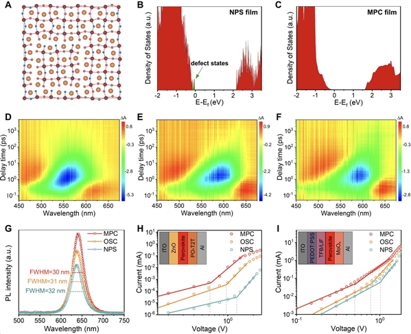 图3. Ruddlesden-Popper (RP)型面缺陷对于钙钛矿带隙以及光电性质的影响。(A) 具有二维RP缺陷限域的NPS膜的晶格模型。(B,C) NPS (B)以及MPC (C)膜的态密度计算。(D-F) NPS (D), OSC (E)和MPC (F)薄膜的瞬态吸收等高线图。(G) 稳态荧光光谱。(H,I)单电子(H)和单空穴(I)的电流电压曲线。