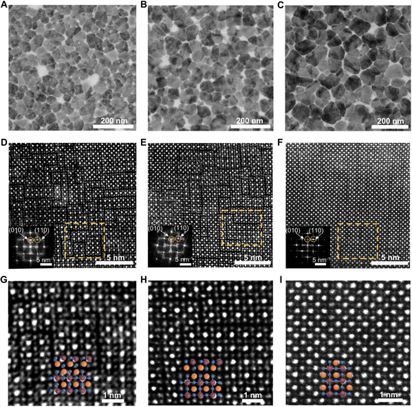 图2.不同结晶过程制备的CsPbI3-xBrx薄膜晶粒内部的RP型面缺陷表征。(A-C)没有聚合物引发的相分离过程(NPS)(A),一步法退火(OSC)(B)和亚稳相结晶(MPC)(C)薄膜的TEM图。(D-E) NPS (D), OSC(E)和MPC(F)膜晶粒内部的HAADF-STEM图。内部插图是相应的快速傅里叶变换图。(G-I)D-F图中相应的原子级分辨的HAADF-STEM放大图。