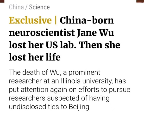2. 据披露,吴瑛教授是特朗普政府时期“中国行动计划”的受害者之一。美国国立卫生研究院对吴瑛进行了长期调查,最终导致她的实验室被关闭,科研权被剥夺。尽管她从未被正式起诉,但这些调查对她的职业生涯造成了毁灭性打击。吴瑛教授自杀后,西北大学和美国国立卫生研究院态度微妙,进一步加剧了吴瑛教授的死因争议。