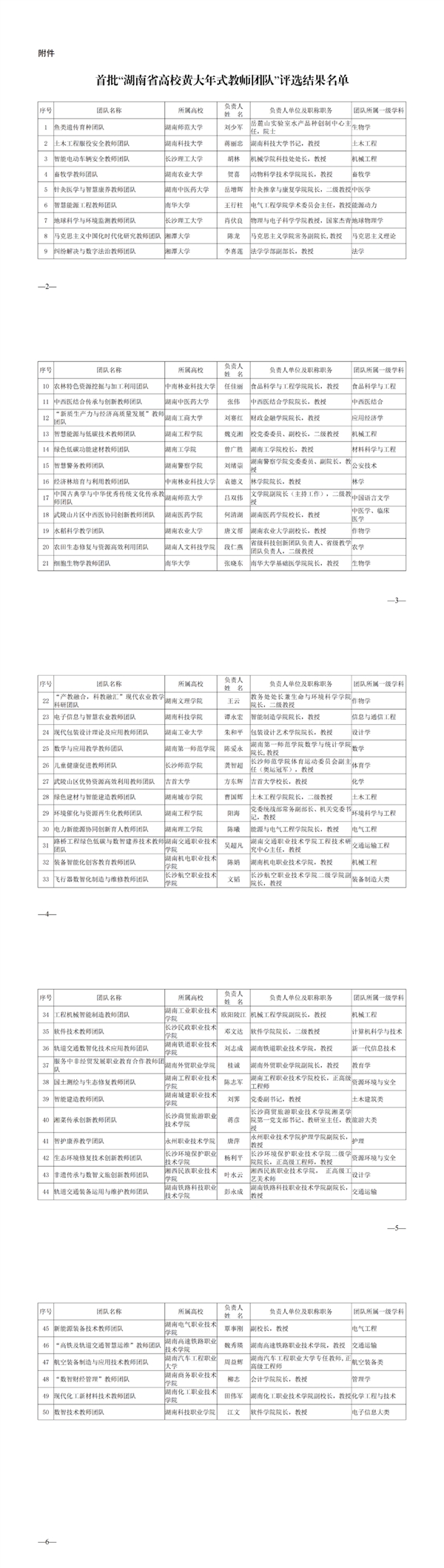 根据《湖南省教育厅关于开展首批“湖南省高校黄大年式教师团队”创建活动的通知》要求,经各高校推荐、省级评审,拟确定湖南师范大学鱼类遗传育种团队等50个教师团队为首批“湖南省高校黄大年式教师团队”。
