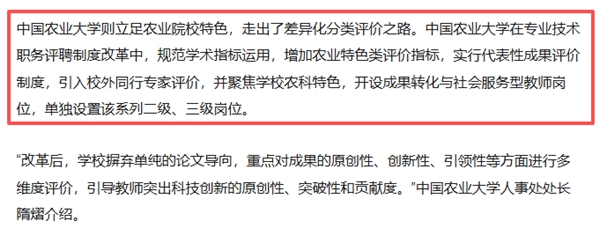 中国农业大学在职称评聘中增加了农业特色类评价指标,实行代表性成果评价制度,还专门开设了成果转化与社会服务型教师岗位。