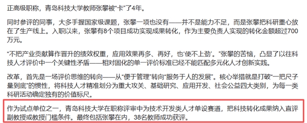青岛科技大学在职称评审中为技术开发类人才单设了赛道,把科技成果转化纳入直评条件。该校教师张攀入职以来有8个项目成功实现成果转化,总金额超过700万元,但因为没有什么国家级课题,过去评职称总是被卡。改革后,他评上了正高级职称。