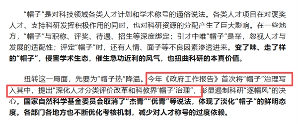 2020年,教育部印发文件,明确提出不将人才称号作为评价人才、配置学术资源的唯一依据,也不单纯以人才称号获得者数量评价队伍建设成效。政策指向清晰:给“帽子”松绑,让它回归荣誉本身。