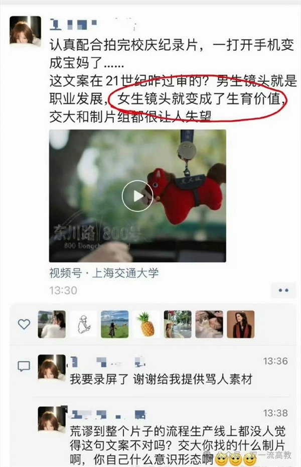 2026年3月31日,上海交通大学推出130周年校庆微电影《东川路800号》。影片中一段描述毕业生职业发展的文案——“电竞大神敲上了代码,舞台C位变成了宝妈”——迅速引发争议。