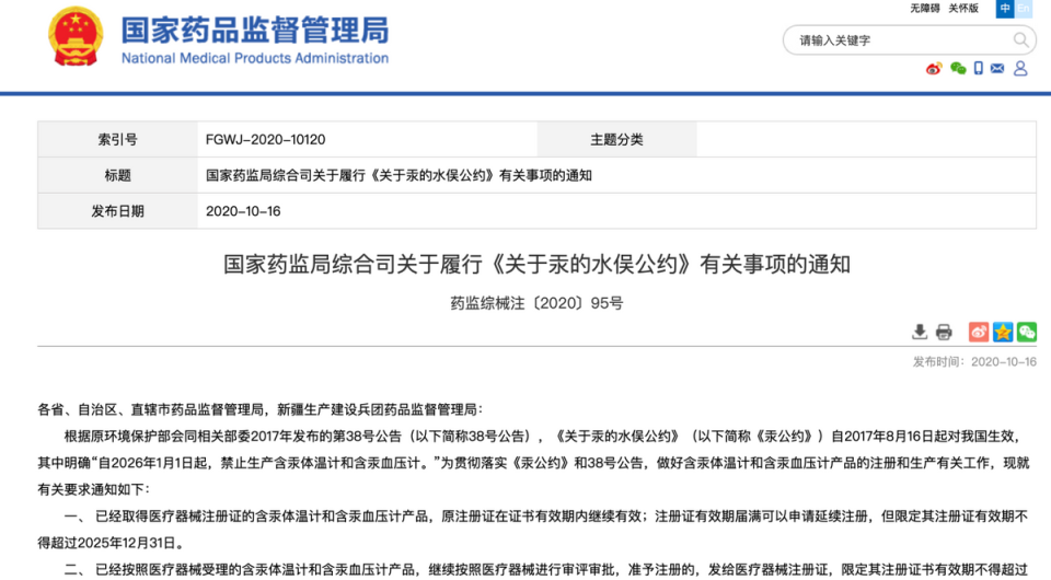 据了解,《关于汞的水俣公约》是联合国主导下为控制和减少全球汞排放而制定的国际环境公约,2013年1月19日由联合国环境规划署通过。国家药监局在通知中指出,根据原环境保护部会同相关部委2017年发布的第38号公告(以下简称38号公告),《关于汞的水俣公约》自2017年8月16日起对我国生效,其中明确“自2026年1月1日起,禁止生产含汞体温计和含汞血压计。”为贯彻落实《公约》和38号公告,做好含汞体温计和含汞血压计产品的注册和生产有关工作,自2026年1月1日起,全面禁止生产含汞体温计和含汞血压计产品。