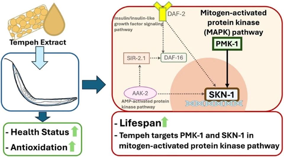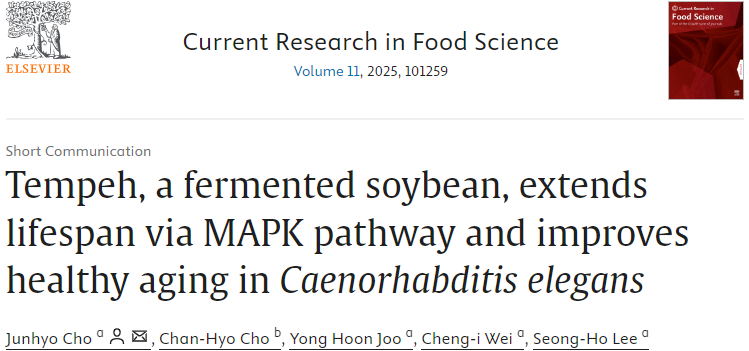 近日,来自美国马里兰大学营养与食品科学系的研究团队在 Current Research in Food Science 杂志发表题为“Tempeh, a fermented soybean, extends lifespan via MAPK pathway and improves healthy aging in Caenorhabditis elegans”的文章。