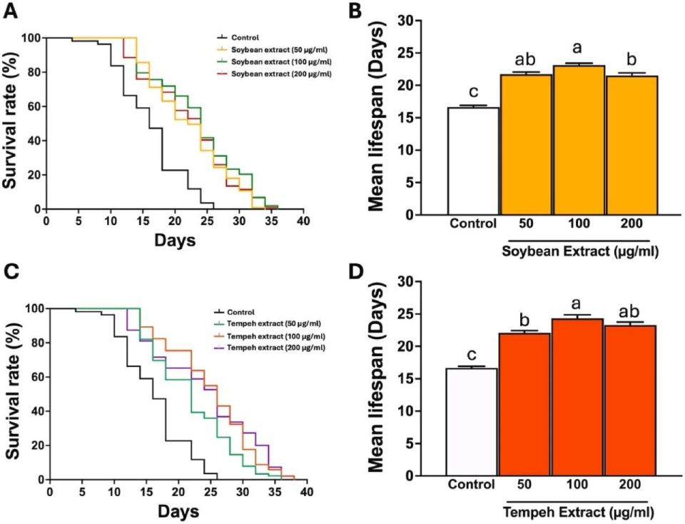 先前的研究表明,大豆提取物可延长线虫的寿命。本研究发现,当用大豆提取物处理线虫时,在 50、100 和 200 μg/ml 的浓度下,线虫的平均寿命分别延长了约 30%、38% 和 29%。而在浓度分别为 50、100 和 200 μg/ml 时,天贝提取物可将线虫平均寿命分别延长了 32%、45% 和 39%。