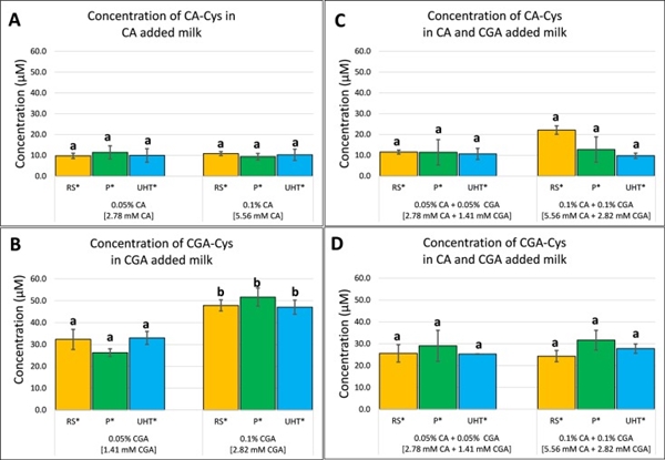 牛奶中加入咖啡酸/绿原酸后,CA-Cys和CGA-Cys的定量