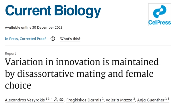 2025年12月30日,德国马克斯·普朗克进化生物学研究所Alexandros Vezyrakis团队在Current Biology在线发表题为“Variation in innovation is maintained by disassortative mating and female choice”的研究论文,该研究显示雌性家鼠择偶偏好由自身创新能力决定:具有创新能力的雌鼠偏好体型大但创新力较低的雄性,而没有创新能力的雌鼠偏好创新型雄性,无论其体型大小。雄性在创新能力和体型之间存在权衡:创新型雄性通常体型较小,竞争力较弱,而非创新型雄性体型更大,更具竞争力。这种“互补”交配策略,结合雄性的创新-竞争权衡,维持了种群中创新行为的多样性。