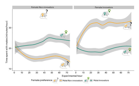 不同创新技能的雌性与雄性相处的时间不同(图源自Current Biology)
