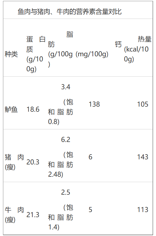 鱼肉作为“白肉”的一种,比起猪牛羊肉来说,热量和饱和脂肪的含量更低,钙等矿物质的含量相对更高,可以作为减重、减脂期的优质蛋白质来源。