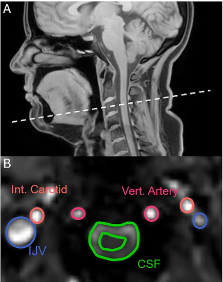 实验的核心监测点位于上颈椎水平(C3 椎骨平面)。研究人员可以实时量化脑脊液、颈内静脉血以及颈动脉血的流速与流向。