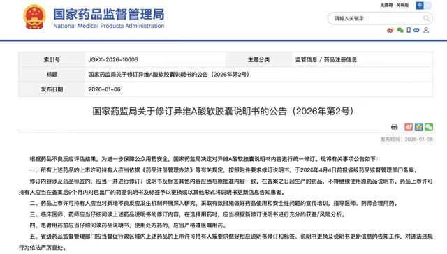 (人民日报健康客户端记者 侯佳欣)寒假期间,是不少学生集中治疗痤疮的高峰期。近日,被誉为“祛痘神药”的异维A酸软胶囊成了众多患者关注的焦点。1月6日,国家药品监督管理局发布公告,对异维A酸软胶囊说明书内容进行统一修订。