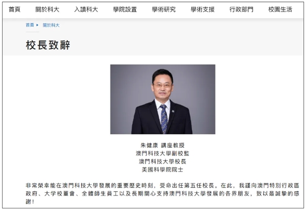 “双一流”院长,任科技大学校长 据澳门科技大学官网显示,现南方科技大学前沿生物技术研究院院长朱健康,已于2026年1月起出任澳门科技大学校长一职,原校长李行伟已卸任。 |