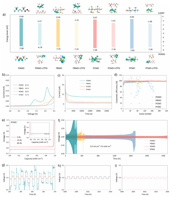 图4:电化学稳定性。(a) HOMO/LUMO能级:PCMO HOMO −7.48 eV,氧化稳定性提升;(b) LSV:PCMO 5.0 V onset最高;(c) 4.5 V恒压浮充:PCMO漏电流最低;(d) Li//Cu CE:PCMO 240圈平均>99.1 %;(e) 首圈成核过电位:PCMO仅90 mV;(f) Li//Li对称循环2500 h极化<25 mV;(g-i) 放大电压曲线:PCMO全程低且平稳。