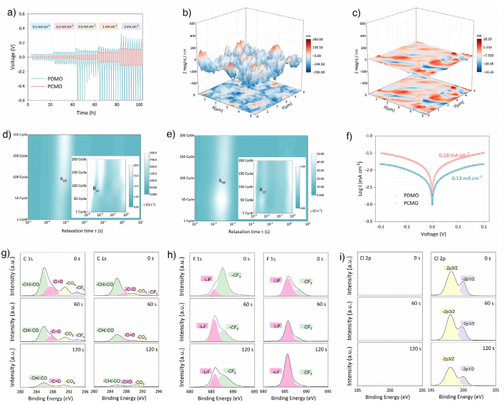 图5:界面表征。(a) 倍率性能:PCMO对称电池2 mA cm-2仍稳定;(b)(c) AFM:PCMO循环后锂表面粗糙度最低;(d)(e) DRT:PCMO RSEI+Rct全程最低;(f) Tafel:PCMO交换电流密度0.18 mA cm-2最大;(g) C 1s深度剖面:PCMO SEI有机组分少;(h) F 1s:LiF信号梯度分布;(i) Cl 2s:PCMO SEI富LiCl,扩散能垒仅0.08 eV。