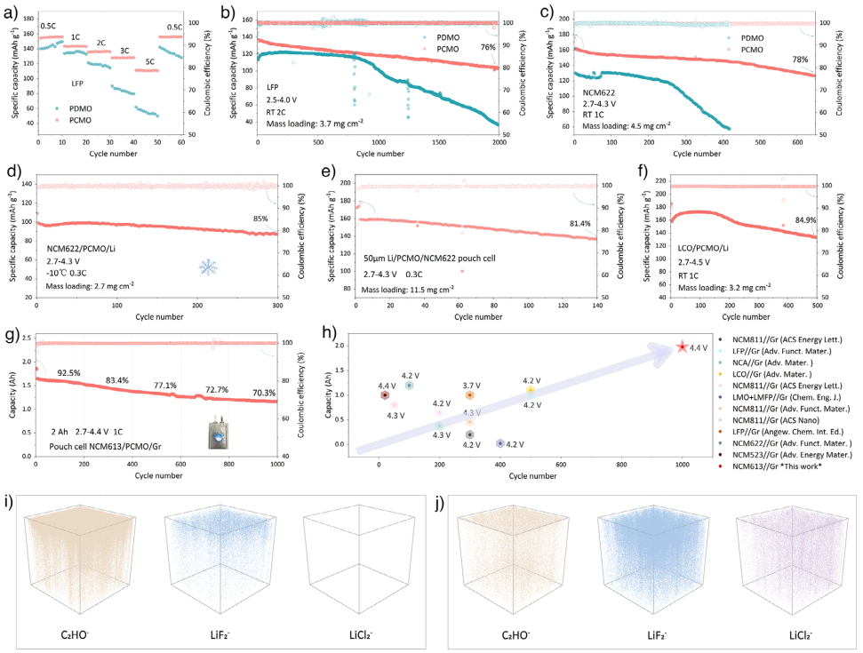 图6:全电池性能。(a) LFP倍率:PCMO 5 C容量保持率>90 %;(b) LFP 2 C长循环:PCMO 2000圈保持76 %,PDMO仅18 %;(c) NCM622 1 C:PCMO 650圈保持78 %;(d) −10 °C低温:PCMO 300圈保持85 %;(e) 33 mAh软包:PCMO 145圈保持83 %;(f) LCO 4.5 V:PCMO 200圈保持85.3 %;(g) 2 Ah NCM622/石墨软包4.4 V:PCMO 1000圈保持70.3 %;(h) 性能对比雷达:PCMO优于已报道聚合物电解质;(i)(j) ToF-SIMS:PCMO CEI富LiF+LiCl且过渡金属溶出最少。
