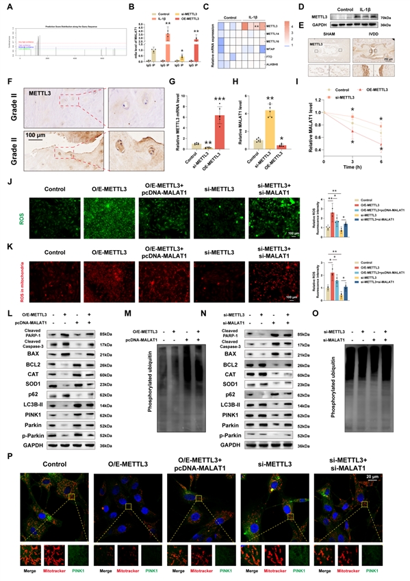 最后,研究在动物模型中进行功能挽救实验。向退变椎间盘内注射过表达MALAT1的病毒,能有效提升局部α-KG水平、增强线粒体自噬,并显著延缓椎间盘结构破坏。然而,若同时过表达METTL3,则会抵消MALAT1的治疗获益。这从整体动物水平验证了 “METTL3 ↑ → m6A-MALAT1 ↓ → miR-23c ↑ → IDH1 ↓ → α-KG ↓ → 线粒体自噬抑制 → 椎间盘退变” 这一全新调控轴的存在及其病理重要性。