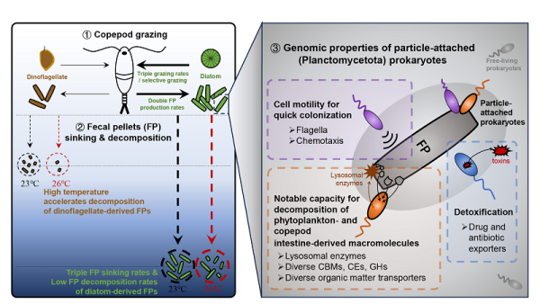研究进一步发现,升温会通过增强关键分解酶基因丰度加快FP分解,且对甲藻来源FP的加速效应更为突出。全球变暖背景下,许多海域持续出现硅藻比例下降、甲藻比例上升的结构性转变,这意味着这些区域的POC会更快被再矿化并滞留在上层海洋。研究强调,在评估碳汇功能变化时,需将浮游植物组成、浮游动物摄食与微生物动力学过程作为一个耦合系统综合考虑,才能更准确刻画BCP的响应与不确定性来源。