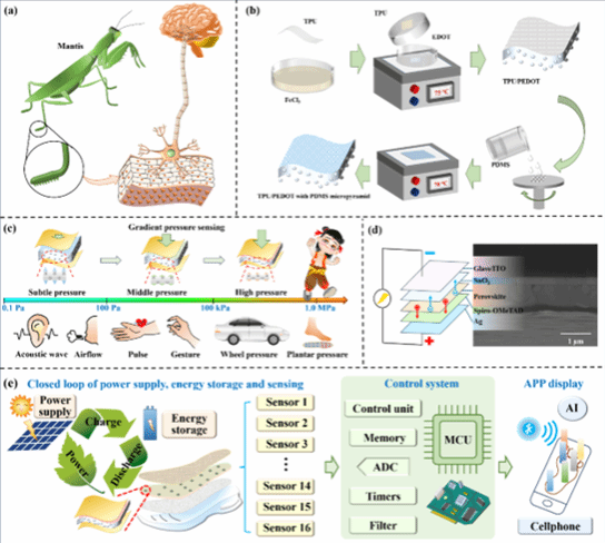 其一,受螳螂腿部分级机械传感结构的启发,该研究设计出双微结构电容传感器。该传感器检测下限低至0.10帕,最大检测量程高达1.4兆帕,可精准区分从微弱到高强度的压力变化;同时,其机械稳定性优异,历经12000次循环加载后性能无显著衰减,性能优于现有柔性压力传感器,适用于鞋垫穿戴场景。