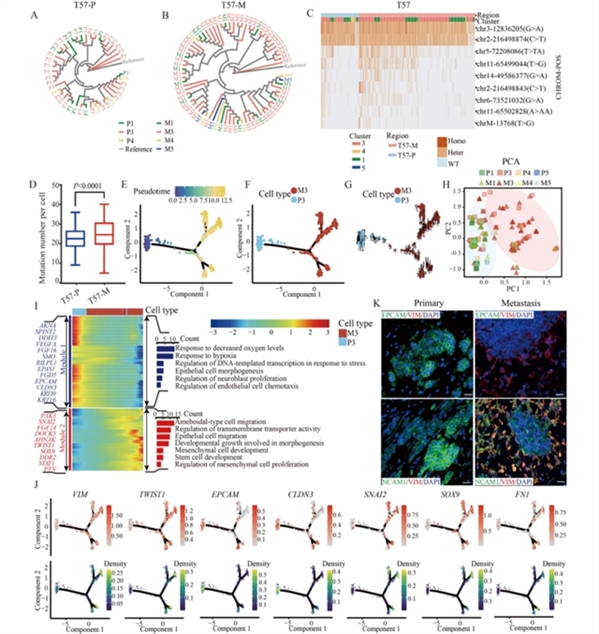 为探究转移的进化轨迹,研究聚焦于包含原发和转移灶匹配样本的T57和T62病例,排除非恶性细胞后进行整合UMAP分析。结果显示,恶性细胞主要按肿瘤起源聚类,但Cluster 3在两个病例中均匀分布,且包含原发和转移灶细胞,提示了其在转移中的保守性(图2)。通过RNA速率分析、Monocle2和Slingshot轨迹推断,发现Cluster 3位于轨迹起始点,具有更高的干细胞特性(信号熵和转录多样性),被命名为“起始”亚群。结合单细胞突变分析(T57病例),构建系统发育树显示Cluster 3具有最多样化的突变,骨髓转移灶突变数量多于原发肿瘤,且与原发Cluster 3共享相似突变模式,支持转移起始细胞来源于原发灶Cluster 3(图3)。