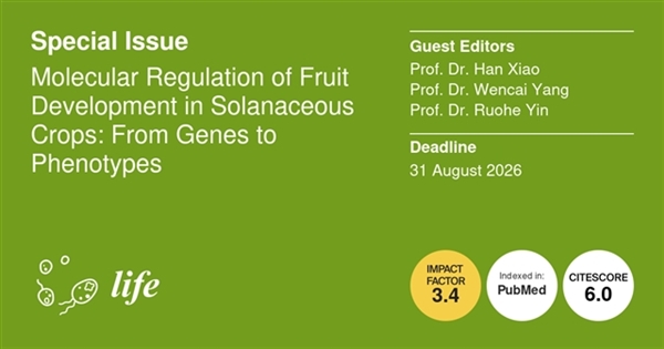 Life 邀请了中国科学院分子植物科学卓越创新中心的肖晗研究员、中国农业大学园艺学院的杨文才教授及上海交通大学农业与生物学院的尹若贺研究员,合作创建特刊 Molecular Regulation of Fruit Development in Solanaceous Crops: From Genes to Phenotypes(茄科作物果实发育的分子调控:从基因到表型)。本期特刊诚邀关于探讨茄科作物果实发育的分子机制的投稿。尤其鼓励采用遗传学、组学、比较分析或果实基因功能分析等方法的研究成果。